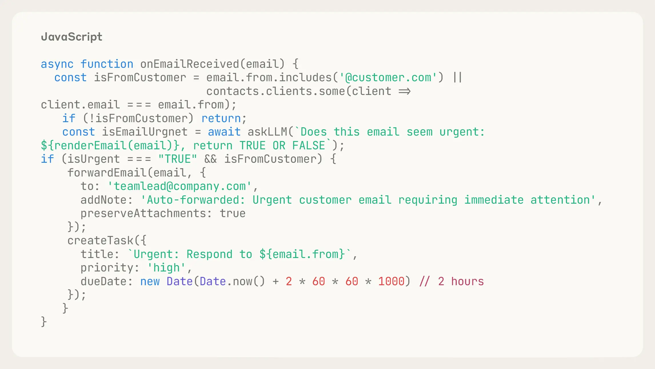 In our email agent, we might want to allow users to create rules for inbound emails. To achieve this, we could write code to run on that event: