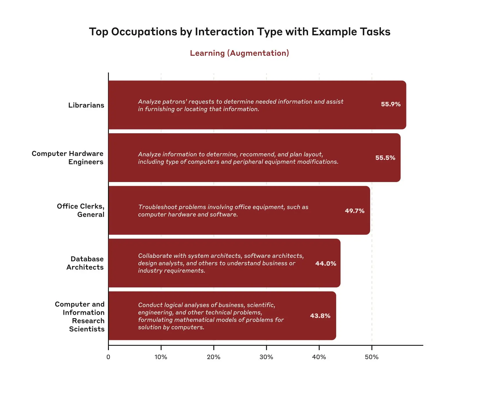 In our last report, we analyzed how AI usage varied between augmentative uses, like learning or iterating on an output, and automative uses, like asking the model to directly complete a task or debug errors. Our analysis shows the balance of augmentation and automation is essentially unchanged in our new data, with augmentation still comprising 57% of usage. However, we did see some change in types of automation and augmentation uses—for example, we saw learning interactions, where the user asks Claude for information or explanation about different topics, rise from ~23% to ~28%.