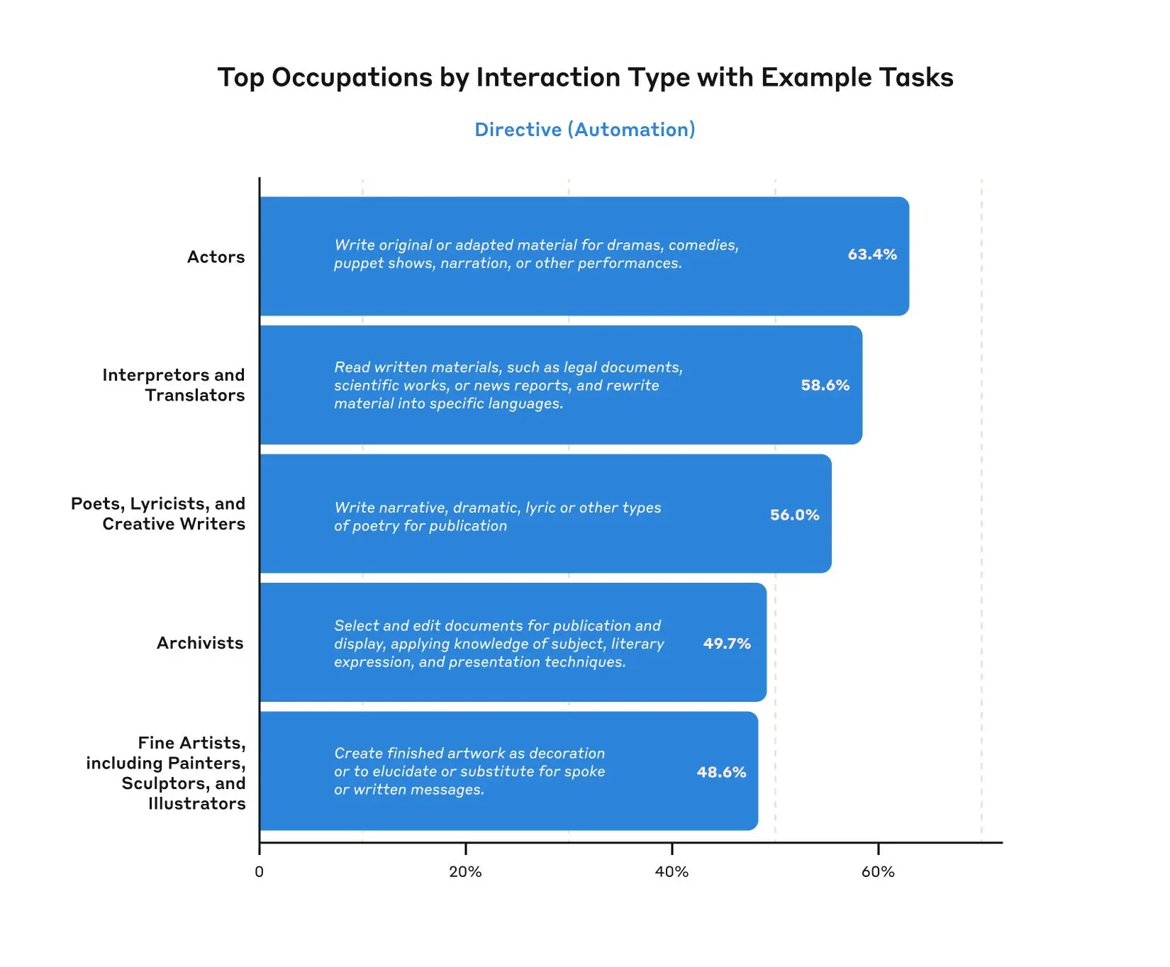 - We're releasing data on augmentation / automation breakdowns on a task- and occupation-level. For example, tasks associated with copywriters and editors show the highest amount of task iteration, where the human and model co-write something together. By contrast, tasks associated with translators and interpreters show among the highest amounts of directive behavior—where the model completes the task with minimal human involvement.