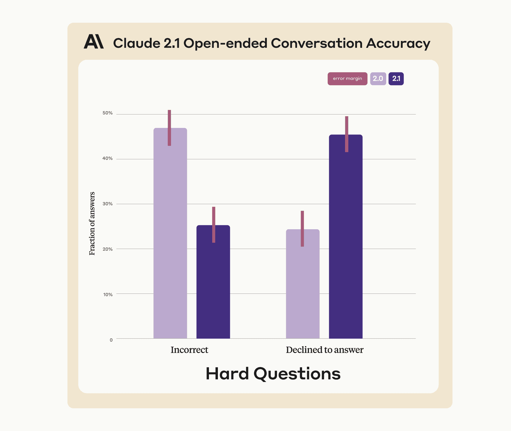Claude 2.1 has also made meaningful improvements in comprehension and summarization, particularly for long, complex documents that demand a high degree of accuracy, such as legal documents, financial reports and technical specifications. In our evaluations, Claude 2.1 demonstrated a 30% reduction in incorrect answers and a 3-4x lower rate of mistakenly concluding a document supports a particular claim.