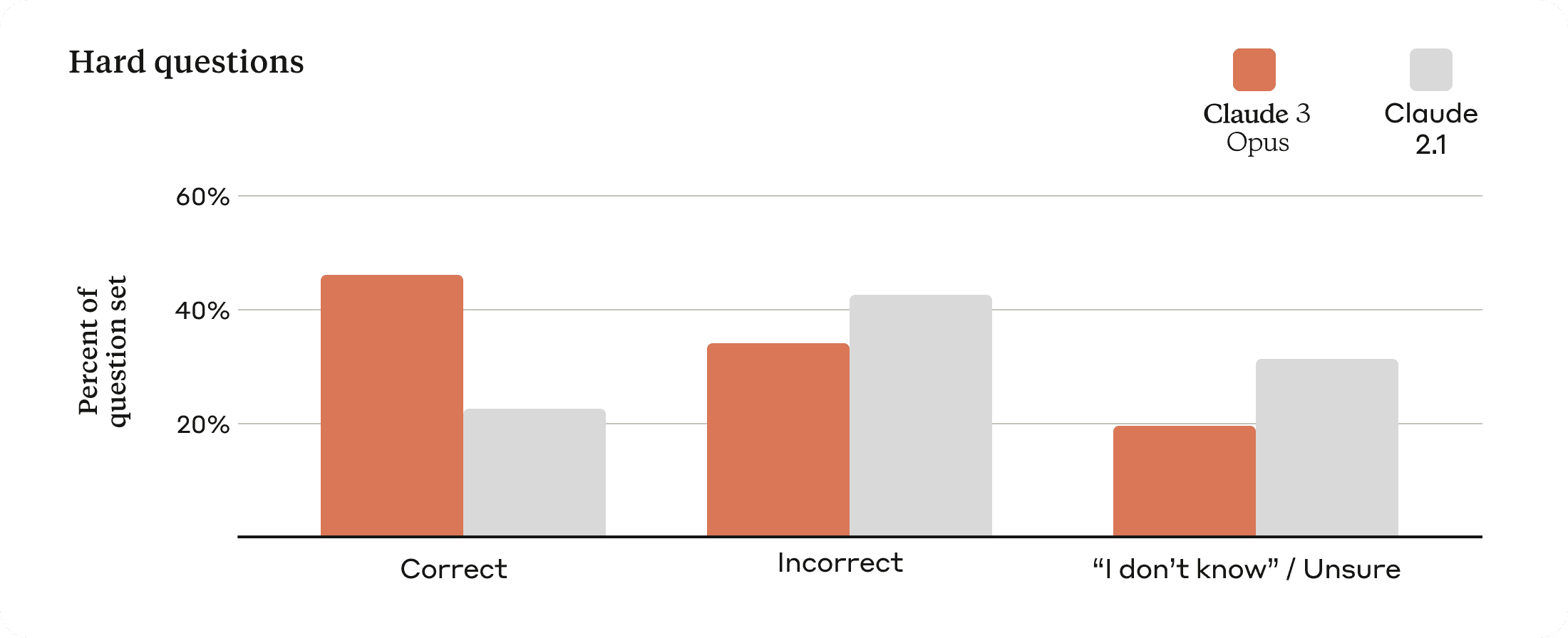 Businesses of all sizes rely on our models to serve their customers, making it imperative for our model outputs to maintain high accuracy at scale. To assess this, we use a large set of complex, factual questions that target known weaknesses in current models. We categorize the responses into correct answers, incorrect answers (or hallucinations), and admissions of uncertainty, where the model says it doesn’t know the answer instead of providing incorrect information. Compared to Claude 2.1, Opus demonstrates a twofold improvement in accuracy (or correct answers) on these challenging open-ended questions while also exhibiting reduced levels of incorrect answers.