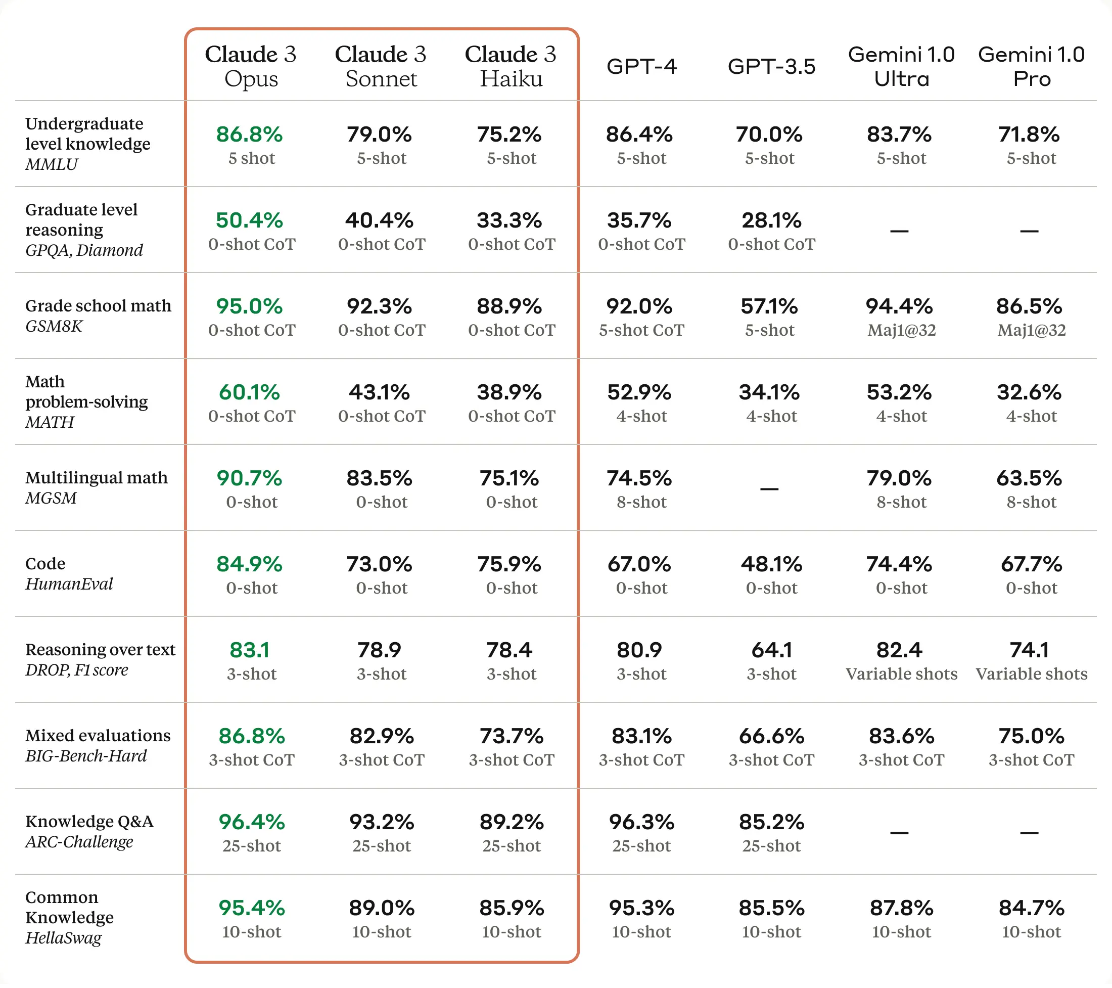 Below is a comparison of the Claude 3 models to those of our peers on multiple benchmarks [1] of capability: