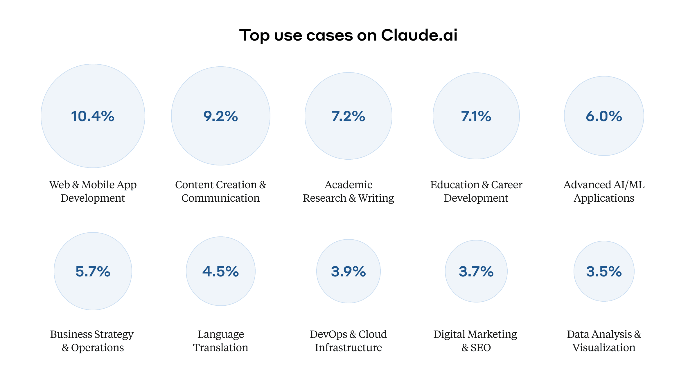 We used Clio to analyze 1 million conversations with Claude on claude.ai (both the Free and Pro tiers) to identify the top tasks people use Claude for. This revealed a particular emphasis on coding-related tasks: the "Web and mobile application development" category represented over 10% of all conversations. Software developers use Claude for tasks ranging from debugging code to explaining Git operations and concepts.