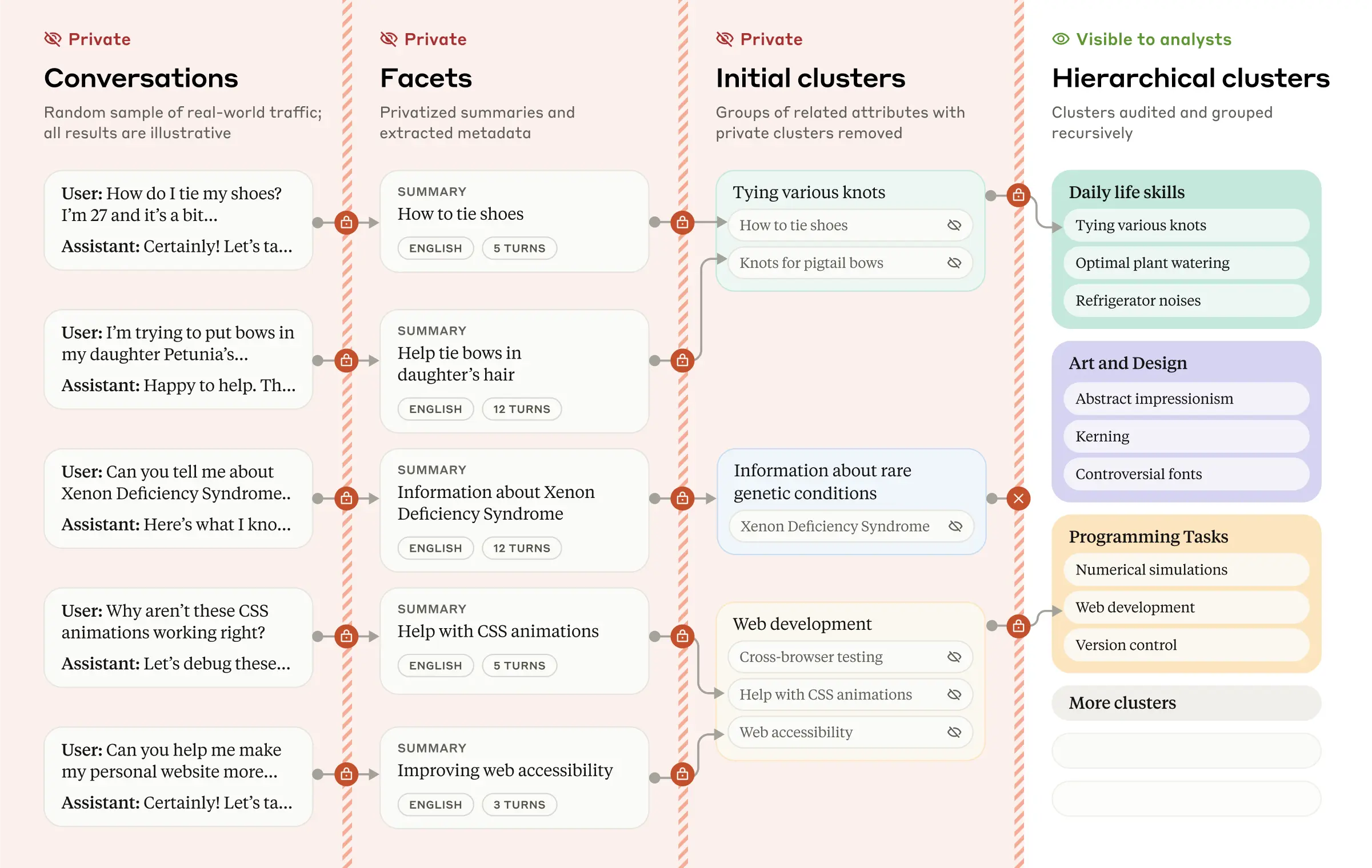 Traditional, top-down safety approaches (such as evaluations and red teaming) rely on knowing what to look for in advance. Clio takes a different approach, enabling bottom-up discovery of patterns by distilling conversations into abstracted, understandable topic clusters. It does so while preserving user privacy: data are automatically anonymized and aggregated, and only the higher-level clusters are visible to human analysts.