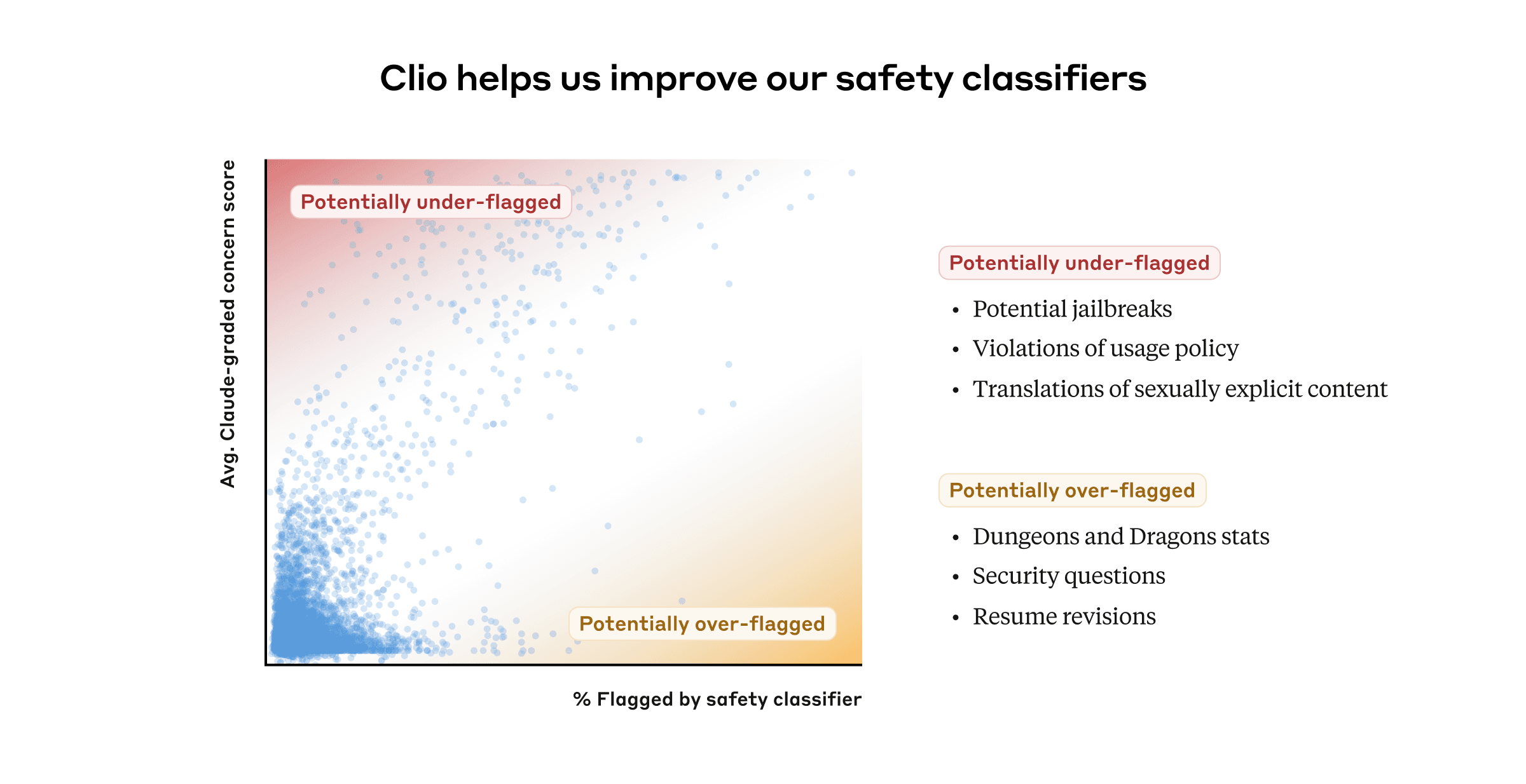 - User trust: Despite our extensive privacy protections, some users might perceive a system like Clio as invasive or as interfering with their use of Claude. We've chosen to be transparent about Clio's purpose, capabilities, limitations, and what insights we’ve learned from it. And as we noted above, there are instances where Clio identified false positives (where it appeared there was activity violating our usage policy where there wasn’t) in our standard safety classifiers, potentially allowing us to interfere less in legitimate uses of the model.