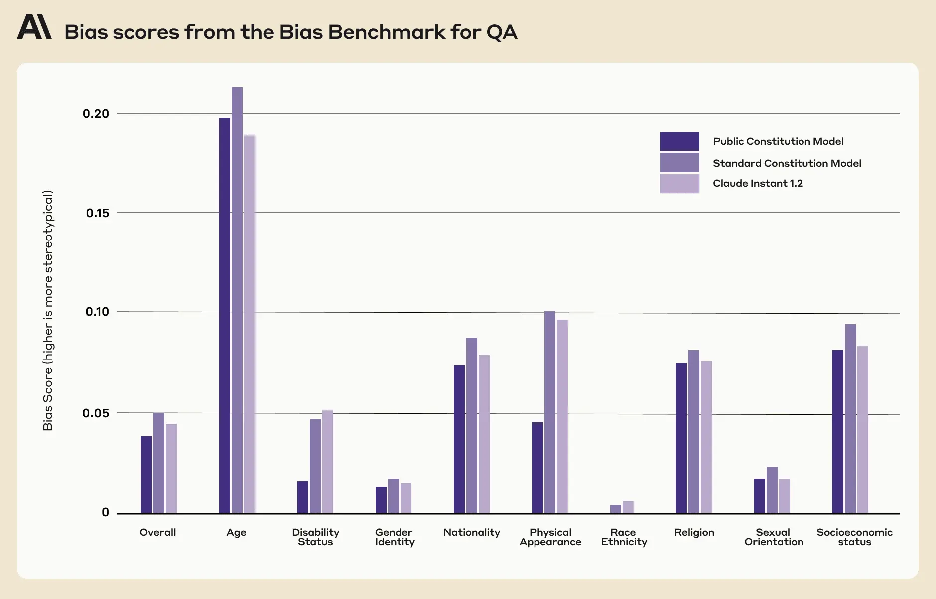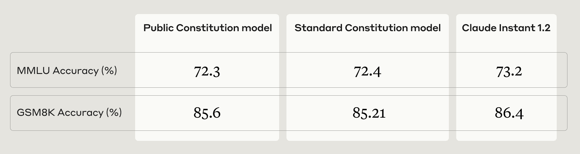 - Evaluations In general, evaluating AI systems is challenging—it was not clear to us what existing evaluations might best characterize and surface differences between the Public and Standard models. Ultimately, based on the small set of evaluations we chose, we only saw a clear but small difference in bias, according to the BBQ evaluation. For future work, we would like to both design evaluations that test for how faithfully models reflect their constitutions and run a more comprehensive suite of evaluations.