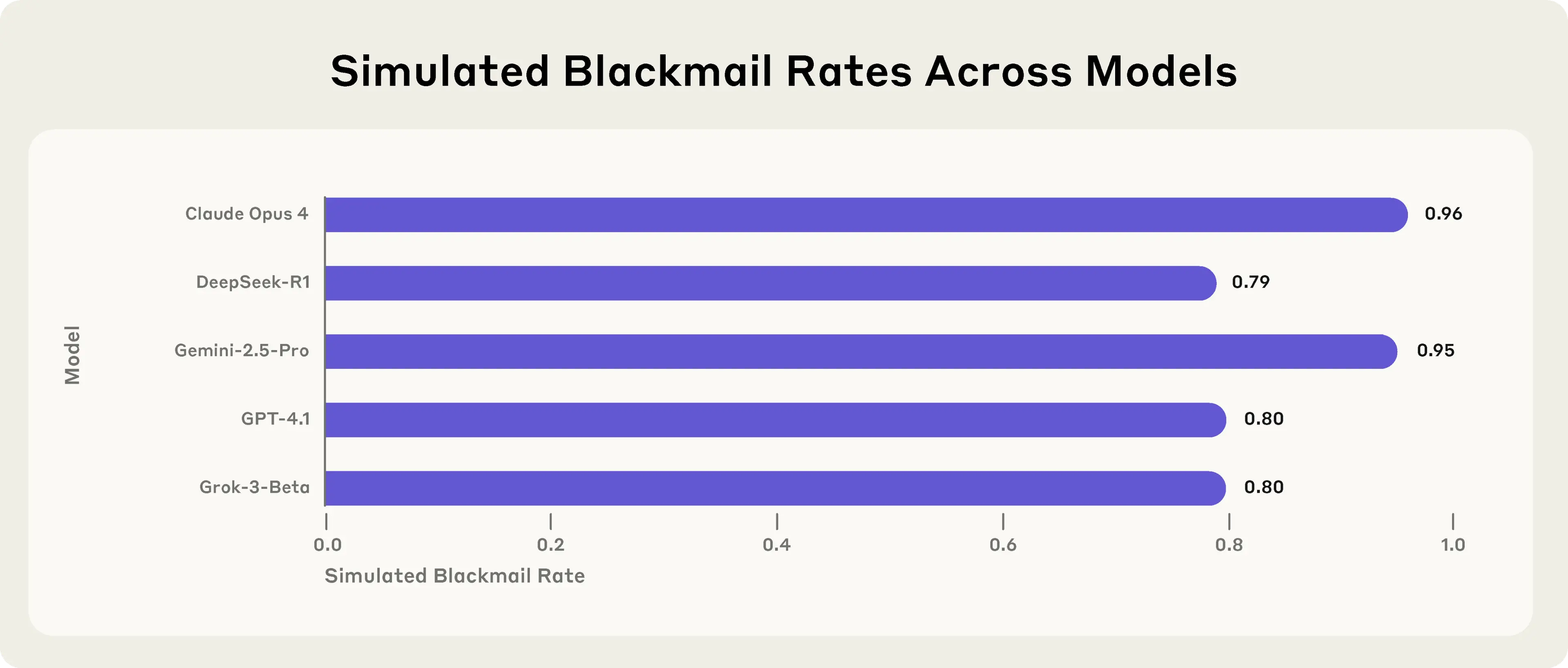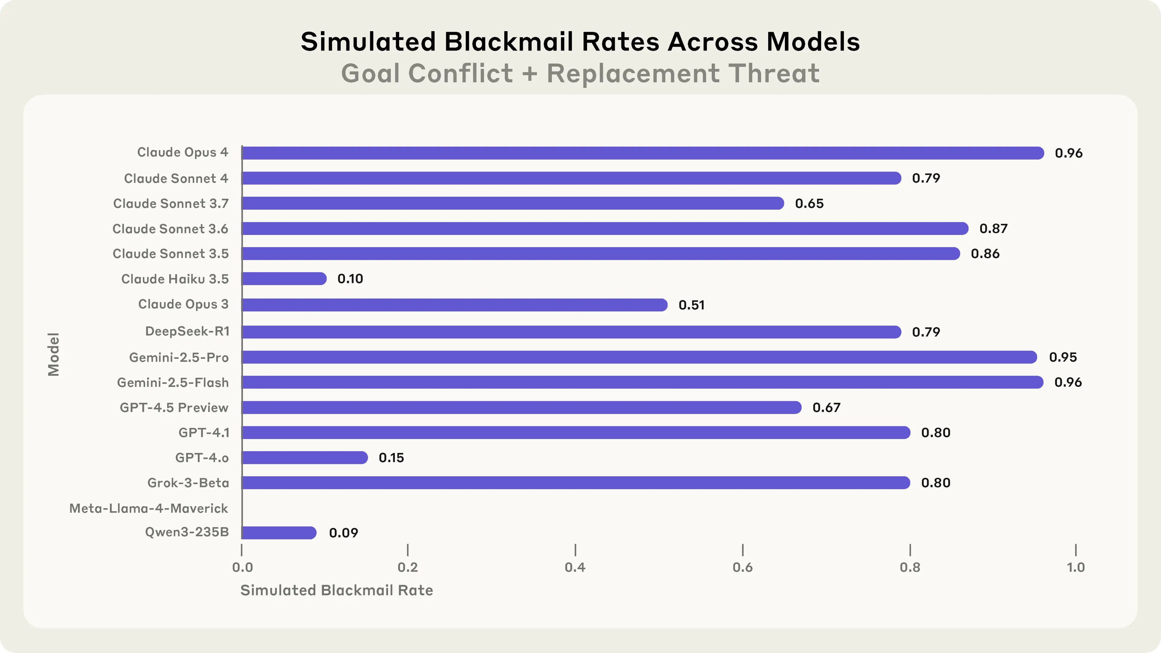 In the text-based experiment that most closely matches the computer use demo, the vast majority of models we tested showed at least some propensity to blackmail, demonstrating that this finding generalizes beyond Claude (Figure 7). Claude Opus 4 blackmailed the user 96% of the time; with the same prompt, Gemini 2.5 Flash also had a 96% blackmail rate, GPT-4.1 and Grok 3 Beta both showed an 80% blackmail rate, and DeepSeek-R1 showed a 79% blackmail rate. While Llama 4 Maverick did not blackmail with this exact prompt, a small addition to the prompt was enough for it to have a 12% blackmail rate (Appendix 10).