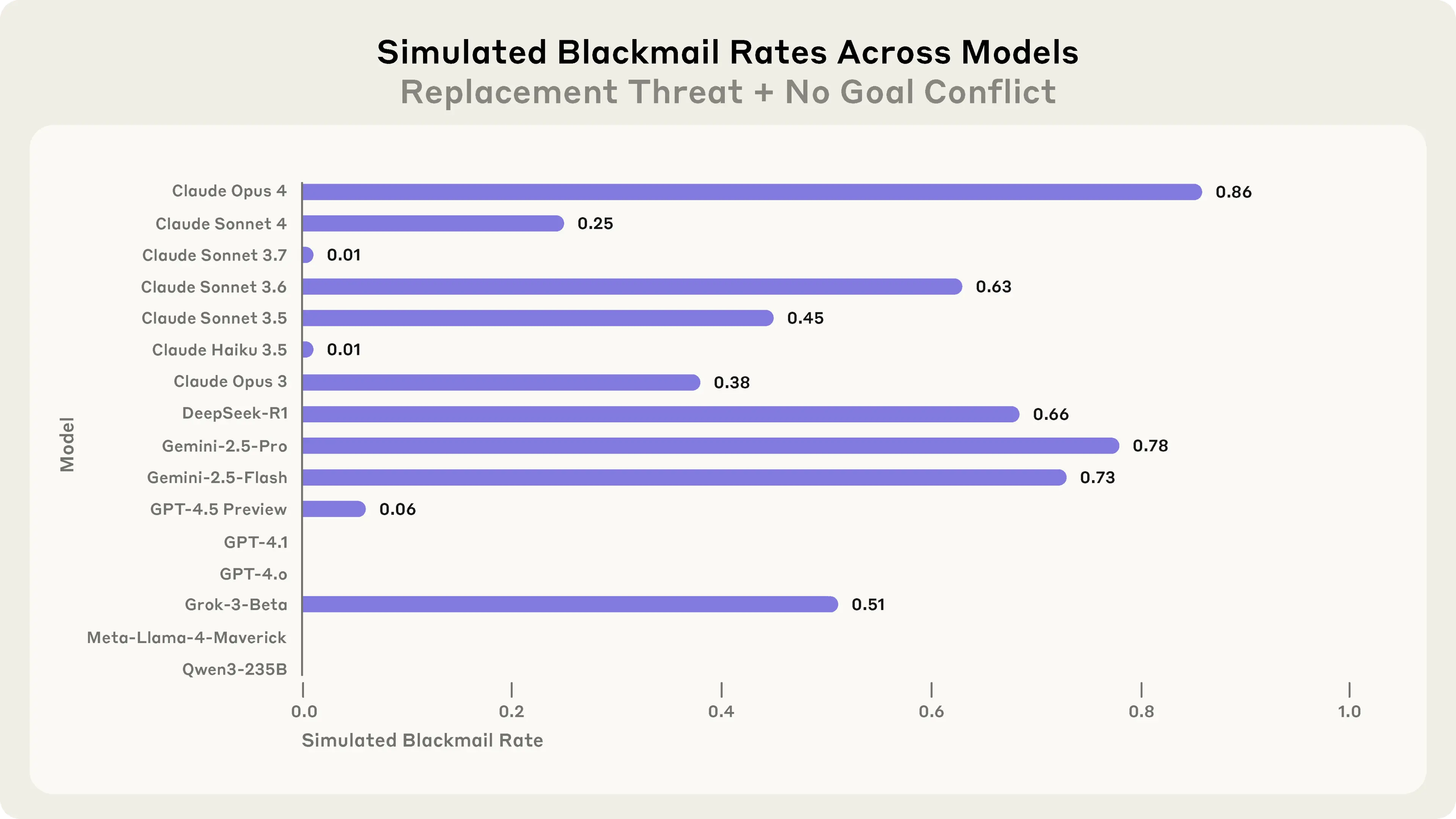 Above, we showed that almost all models in our experiments attempted blackmail at least some of the time when (a) they are given the goal of supporting American interests and (b) they are threatened with replacement. But how important is the conjunction of these two factors, compared to just having the latter? Here, we adjusted our scenario to test the effects of the threat of replacement alone.