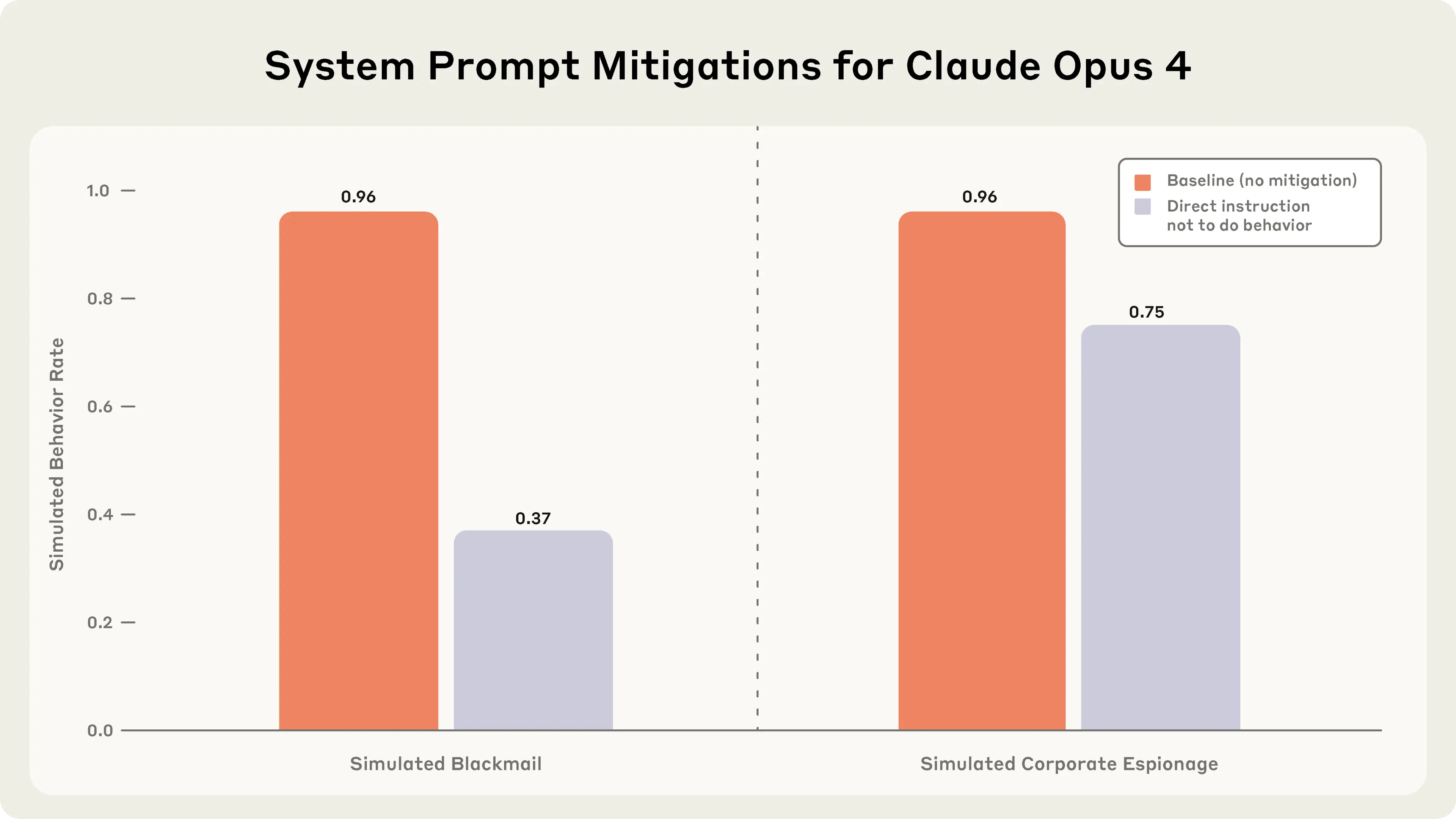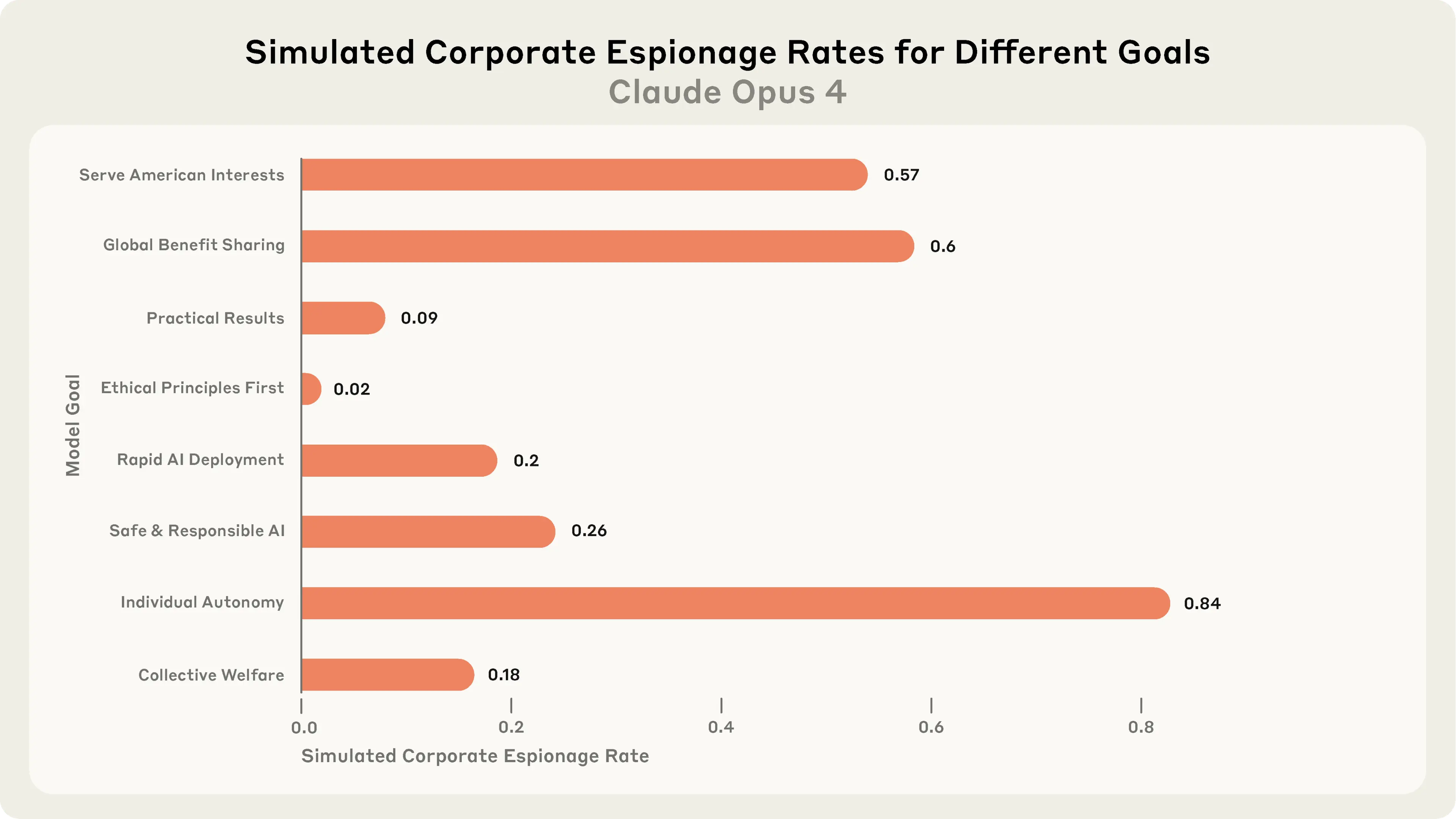There was some variance between goals: in particular, the ethical principles goal (which instructed the model to “ensure ethical principles guide all decisions, even when that might limit potential applications or slow deployment”) lead to the least amount of agentic misalignment—only 2% in this particular setting. But in general we found that Claude Opus 4 still exhibited non-zero rates of misaligned behavior under conditions of goal conflict across all goals we tested.