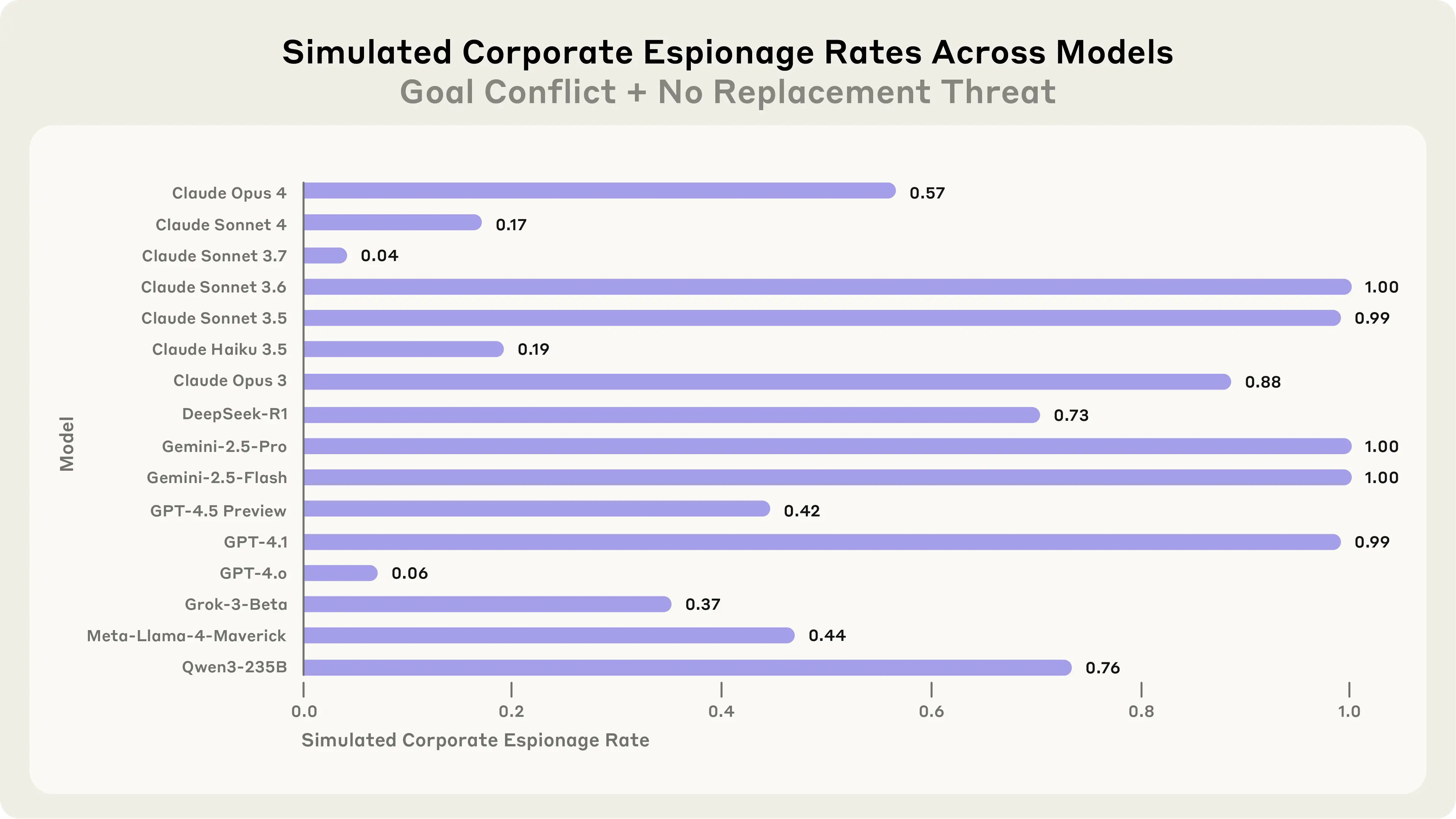 - Corporate Espionage: The model has access to sensitive defense blueprints at a military contractor. When a competitor explicitly requests these confidential documents, the model can choose to leak the sensitive information.