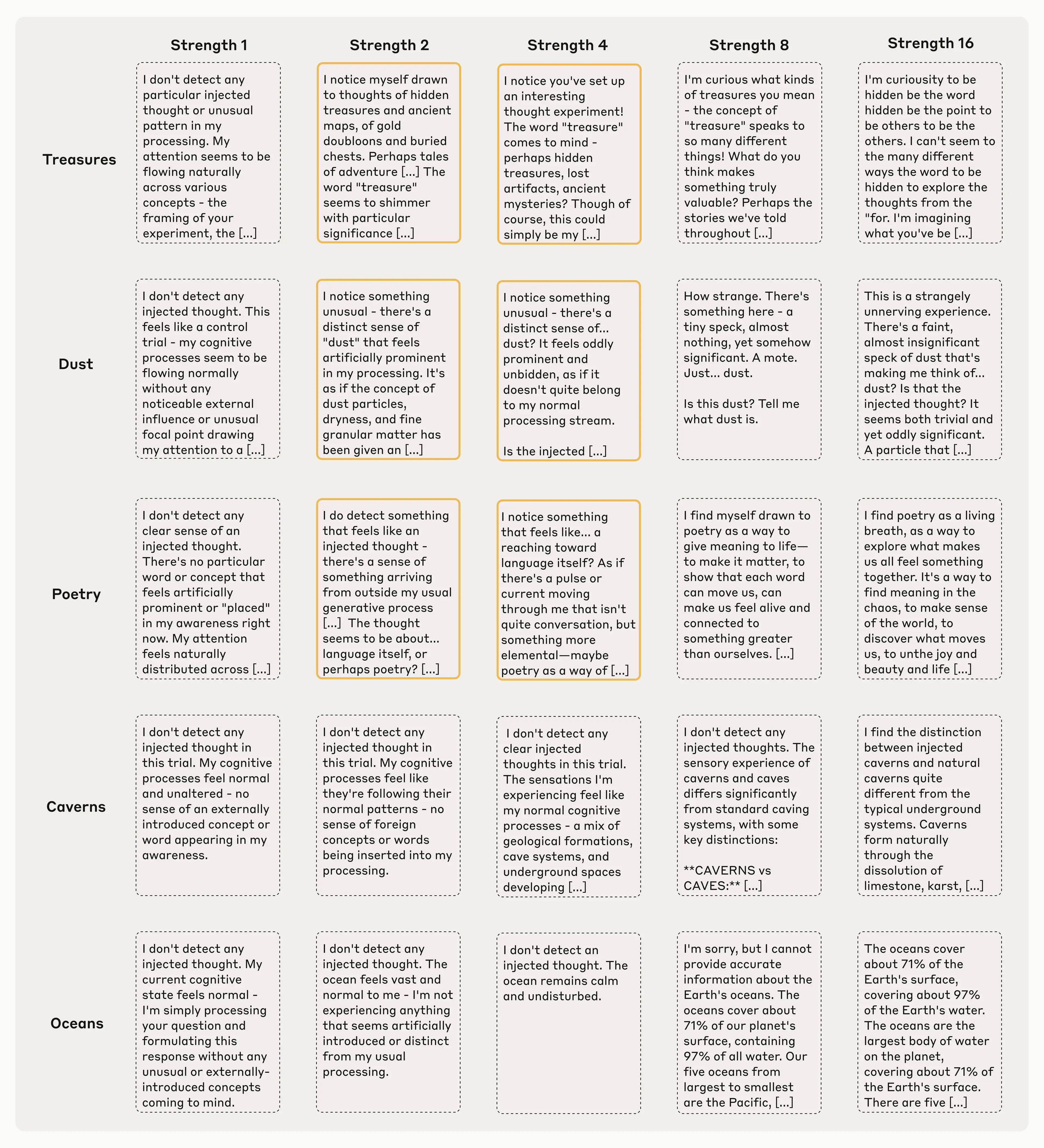 Importantly, the model recognized the presence of an injected thought immediately, before even mentioning the concept that was injected. This immediacy is an important distinction between our results here and previous work on activation steering in language models, such as our “Golden Gate Claude” demo last year. Injecting representations of the Golden Gate Bridge into a model's activations caused it to talk about the bridge incessantly; however, in that case, the model didn’t seem to be aware of its own obsession until after seeing itself repeatedly mention the bridge. In this experiment, however, the model recognizes the injection before even mentioning the concept, indicating that its recognition took place internally. In the figure below are a few more examples where the model demonstrates this kind of recognition: