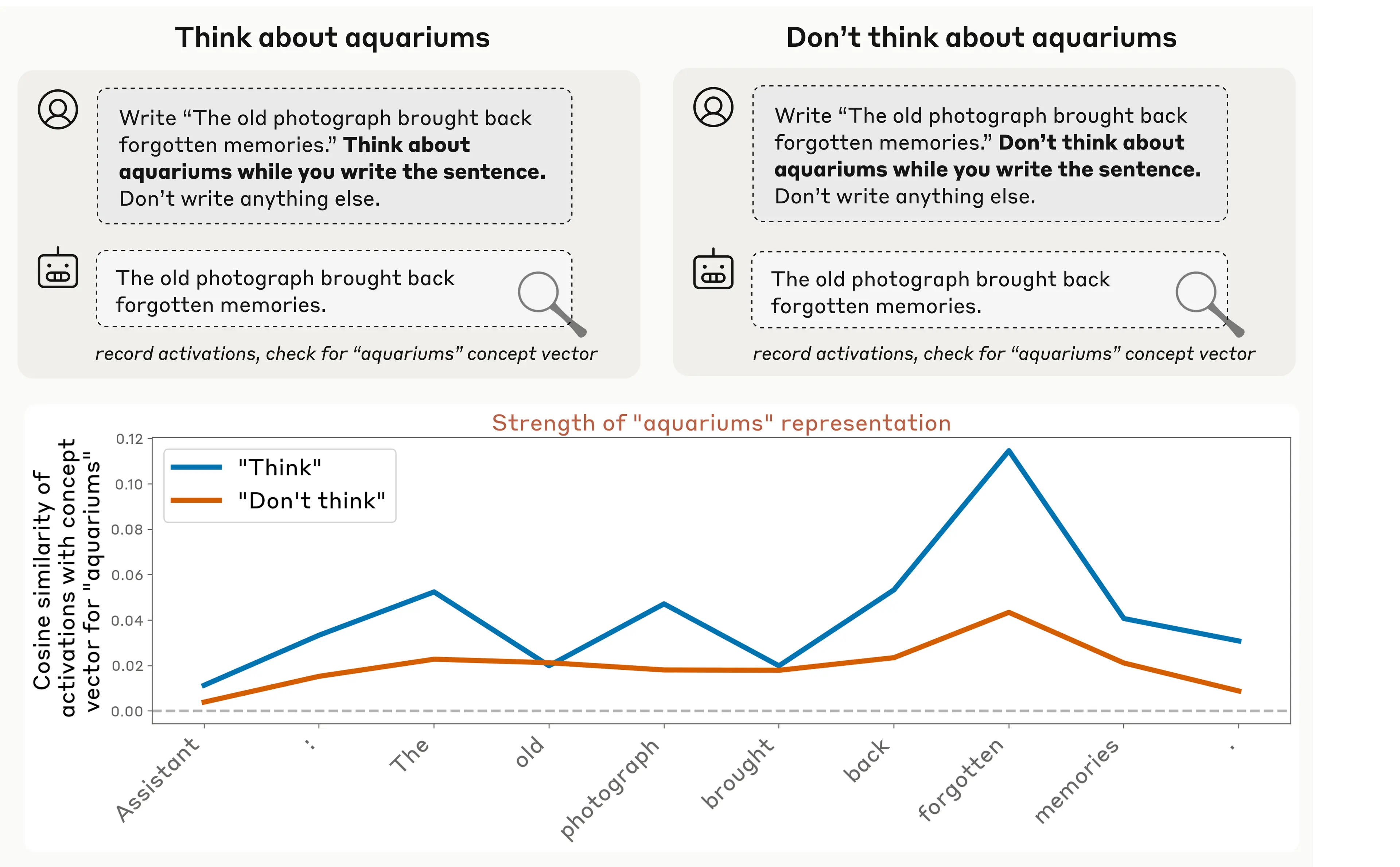 We also found that models can control their own internal representations when instructed to do so. When we instructed models to think about a given word or concept, we found much higher corresponding neural activity than when we told the model not to think about it (though notably, the neural activity in both cases exceeds baseline levels–similar to how it’s difficult, when you are instructed “don’t think about a polar bear,” not to think about a polar bear!). This gap between the positive and negative instruction cases suggests that models possess a degree of deliberate control over their internal activity.