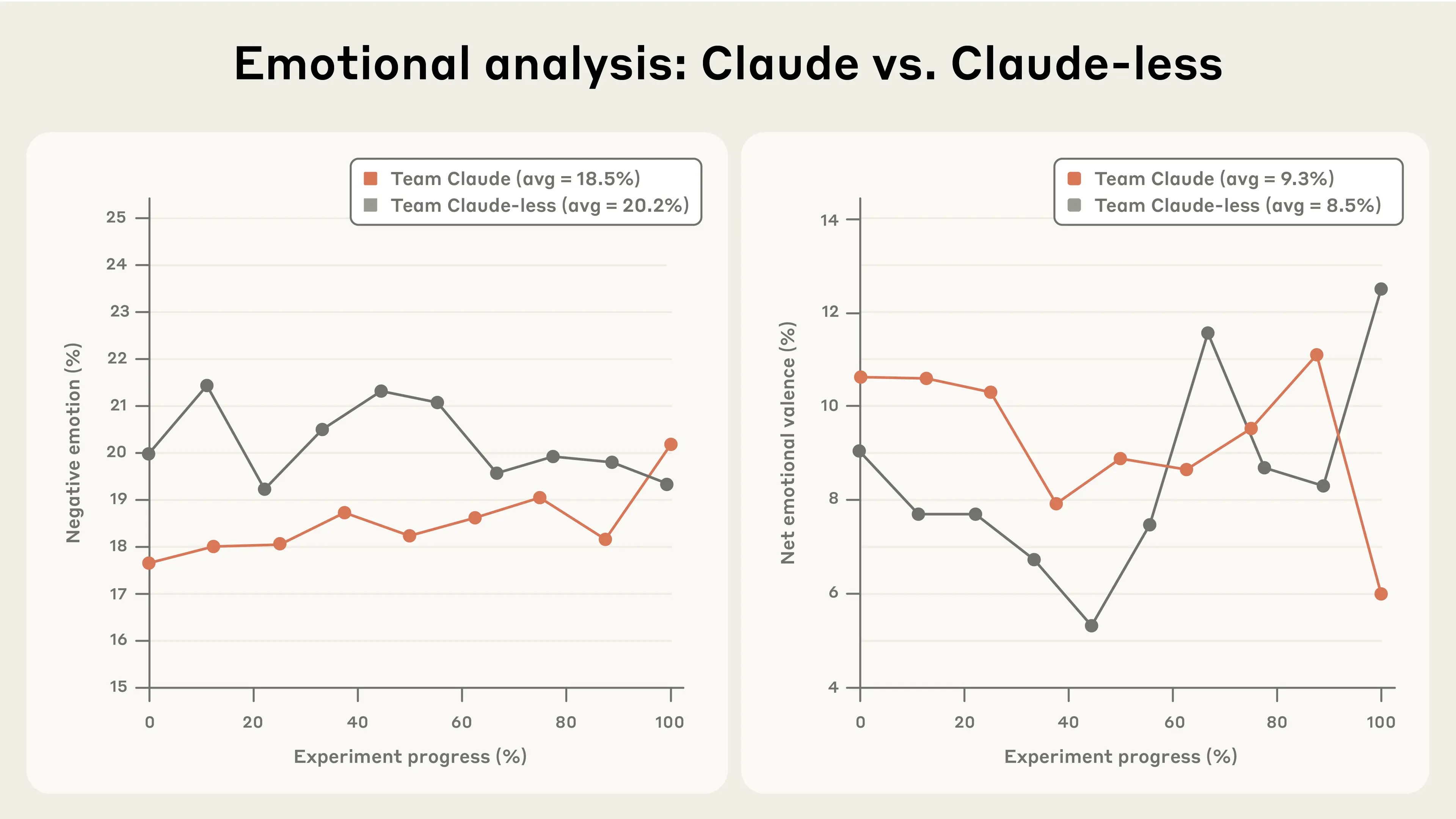 One interpretation would be that the members of Team Claude-less were more engaged and connected with one another. This resonates with some of our upcoming findings from interviews with Anthropic staff.