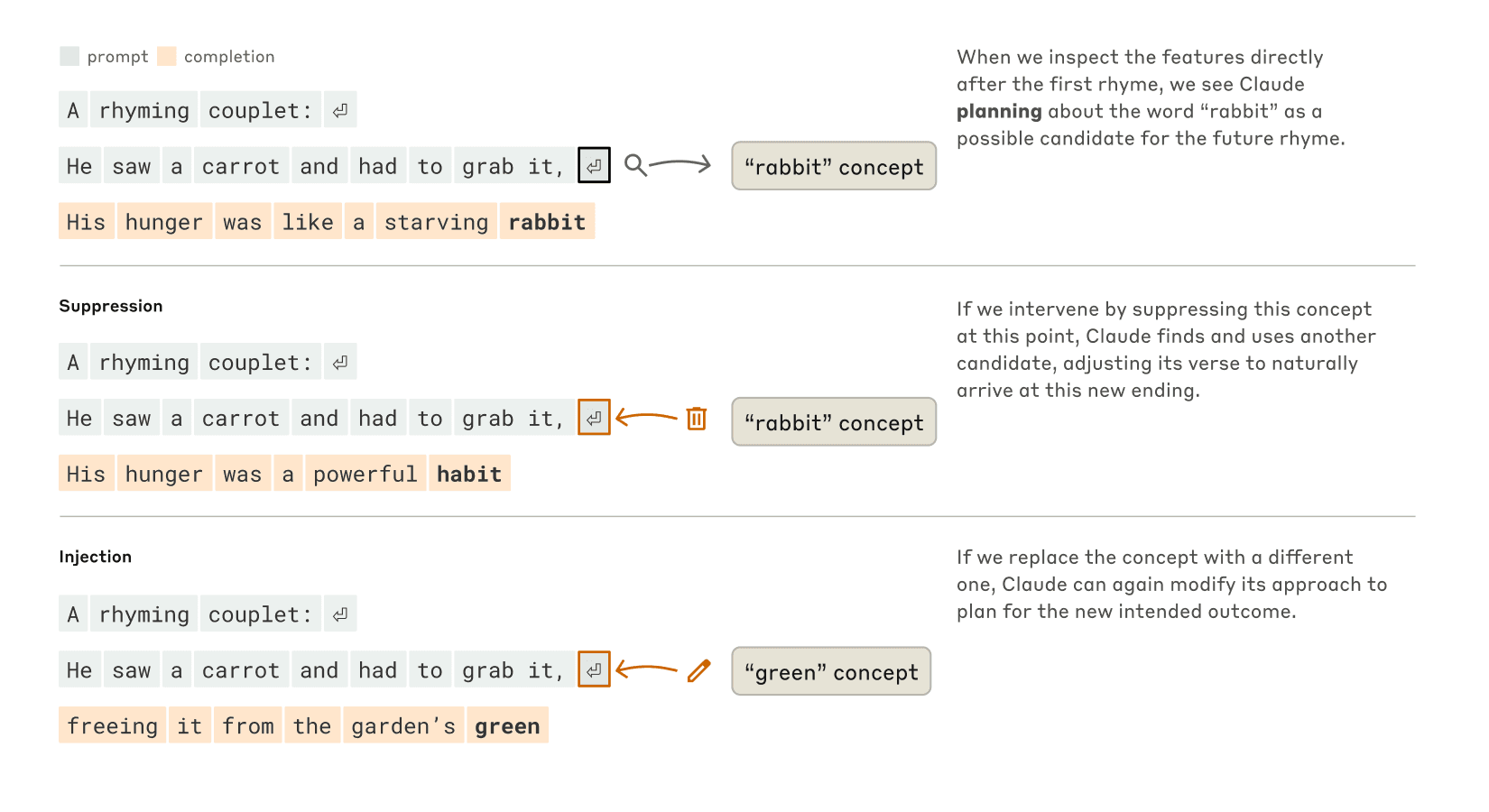 Instead, we found that Claude plans ahead. Before starting the second line, it began "thinking" of potential on-topic words that would rhyme with "grab it". Then, with these plans in mind, it writes a line to end with the planned word.